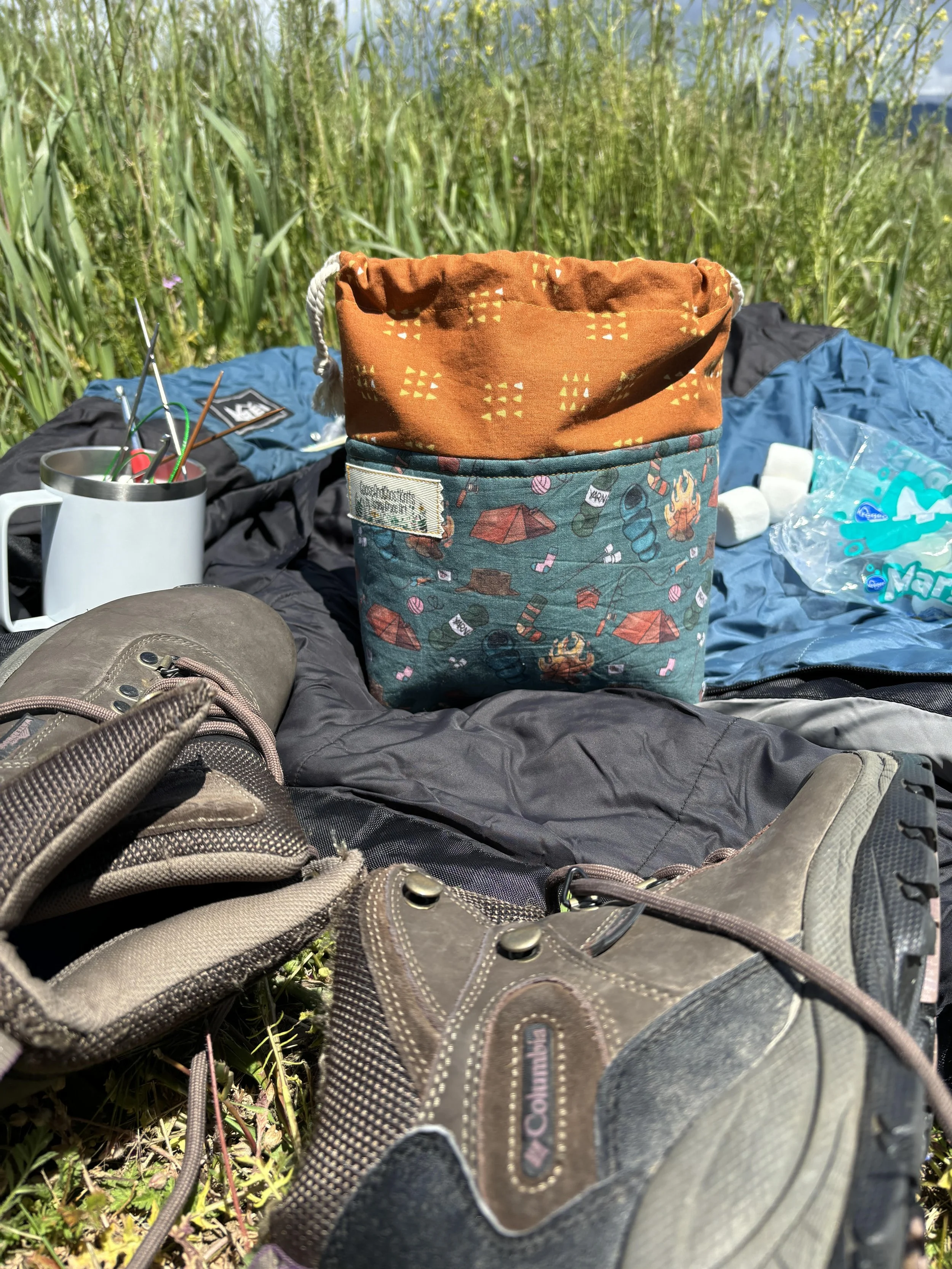 This bag features a custom designed fabric inspired by all of the best parts of camping, which obviously includes sock making! The main fabric has a darker teal background with an orange lining fabric and natural toned cotton drawstring. The small size drawstring perfectly fits 1-2 skein projects. Dimensions at the base are 4” wide x 7.5” length x 9” tall.