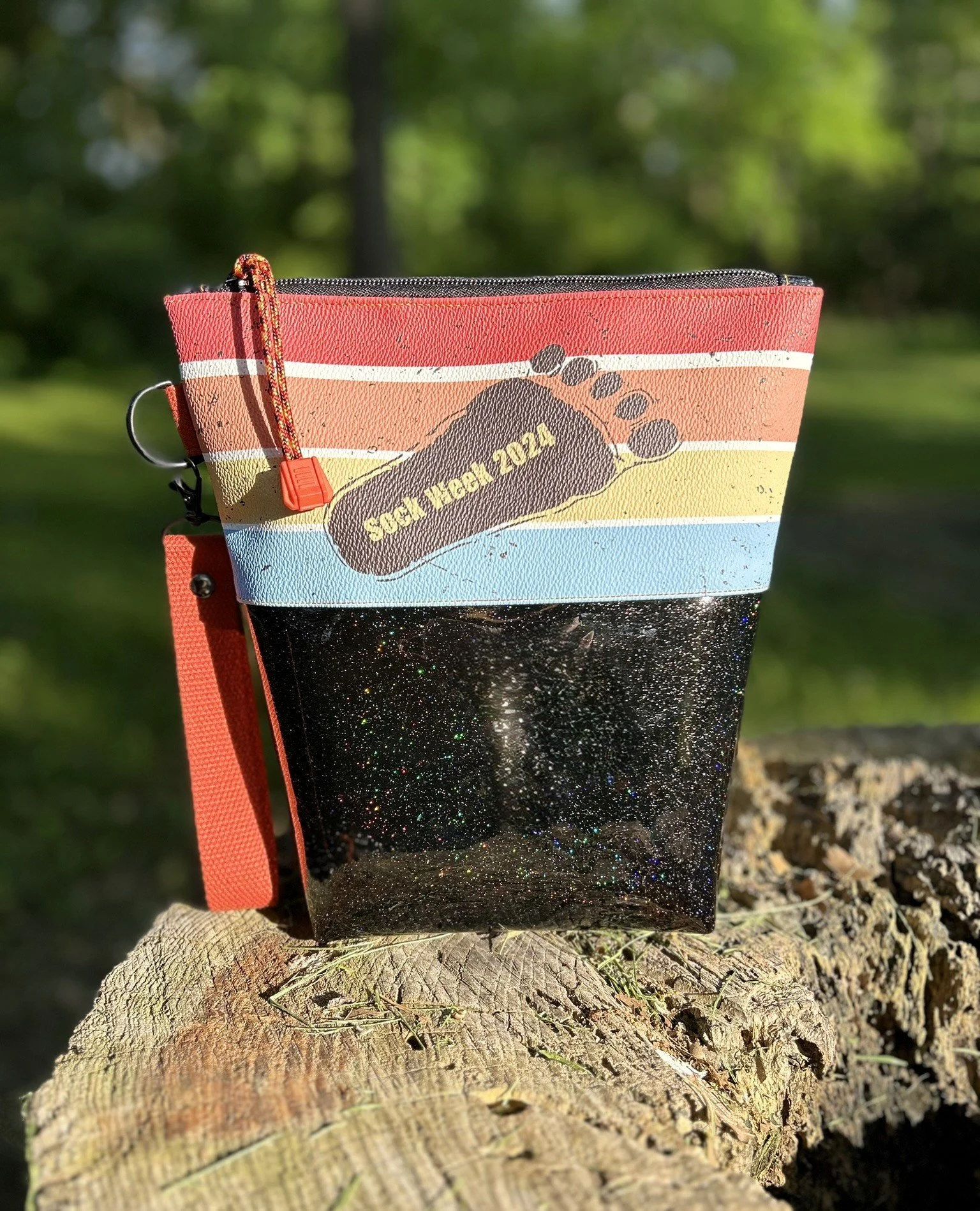 The Socksquatch bag features a custom designed vinyl with a pebbled finish paired with your choice of a clear sparkle vinyl or black sparkle vinyl base, a paracord zipper pull and a matching and removable orange wristlet. On the front, you'll find Socksquatch walking through the woods and on the back, you'll see his footprint and Sock Week 2024 to commemorate this fun week dedicated to knitting socks.